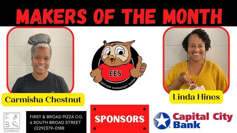 Each month two employees from each school are chosen to be recognized as Grady County Schools' Makers of the Month. For the month of February, selected employees received gifts from First & Broad Pizza Co. and Capital City Bank. Congratulations Makers of the Month and a big THANK YOU to our sponsors!