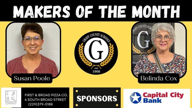 Each month two employees from each school are chosen to be recognized as Grady County Schools' Makers of the Month. For the month of February, selected employees received gifts from First & Broad Pizza Co. and Capital City Bank. Congratulations Makers of the Month and a big THANK YOU to our sponsors!